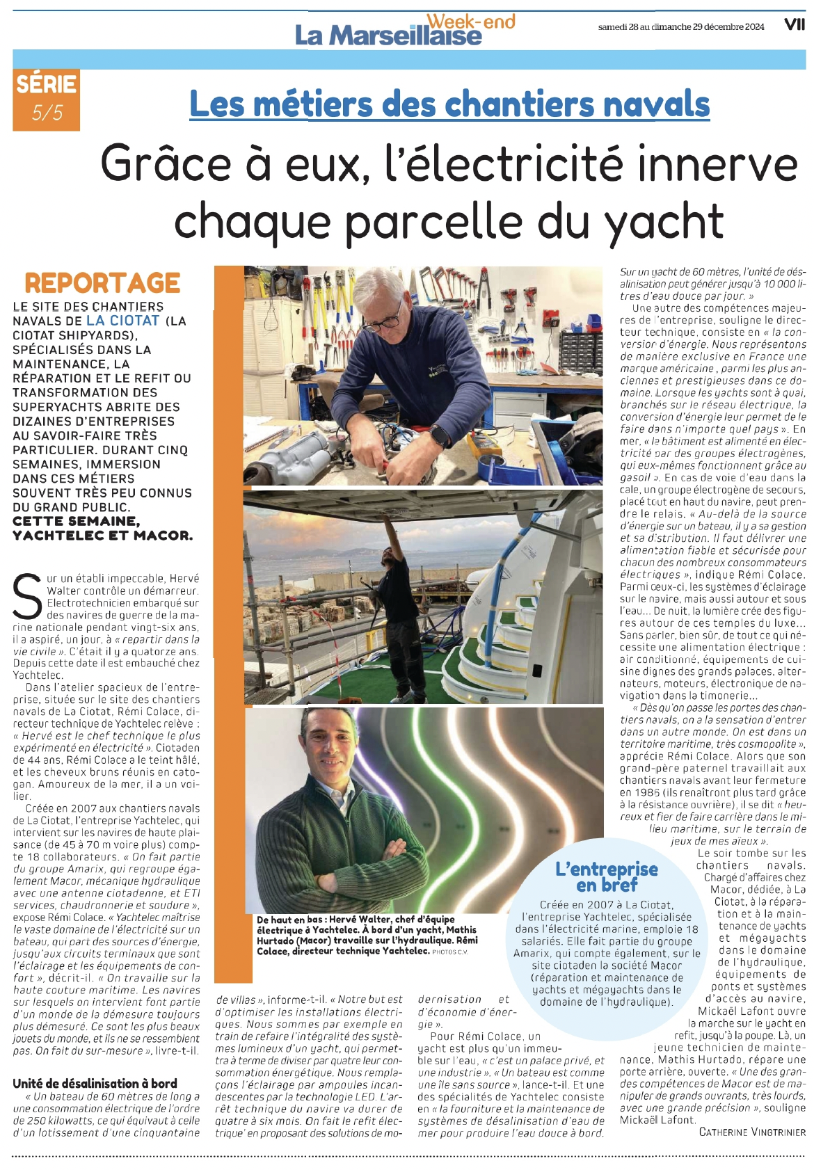 On parle de nous dans la Presse ! Le journal La Marseillaise met en avant Yachtelec et Macor dans un article très intéressant dans son magazine hors-série consacré à la découverte des métiers des Chantiers Navals de La Ciotat ce 29 décembre 2024. Découvrez nos services, nos équipes, notre savoir-faire et l’histoire de Yachtelec & Macor dans ce milieu exigeant des Yachts.